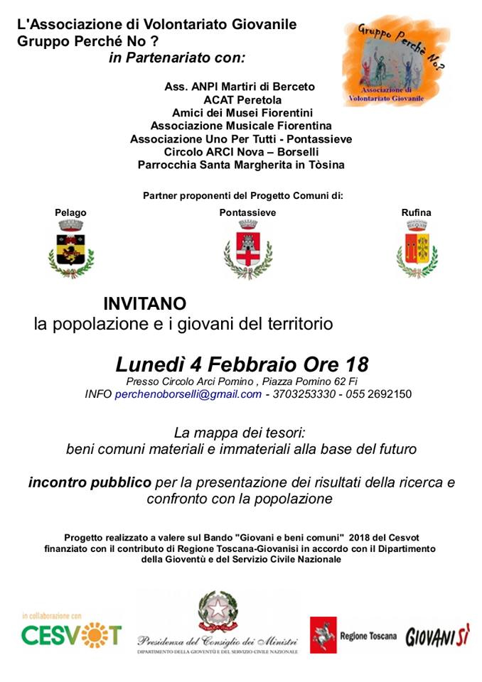 Ne parliamo tutti insieme lunedì 4 febbraio presso il Circolo ARCI di Pomino alle ore 18 con il partenariato di: Ass. ANPI Martiri di Berceto ACAT Peretola Amici dei Musei Fiorentini Associazione Musicale Fiorentina Associazione Uno Per Tutti – Sieci Circolo ARCI Nova – Borselli Parrocchia Santa Margherita in Tòsina Con il Patrocinio e la collaborazione dei Comuni di: Pelago, Rufina e Unione dei Comuni Progetto realizzato a valere sul Bando "Giovani e beni comuni" 2018 del Cesvot finanziato con il contributo di Regione Toscana GiovaniSì in accordo con il Dipartimento della Gioventù e del Servizio Civile Nazionale